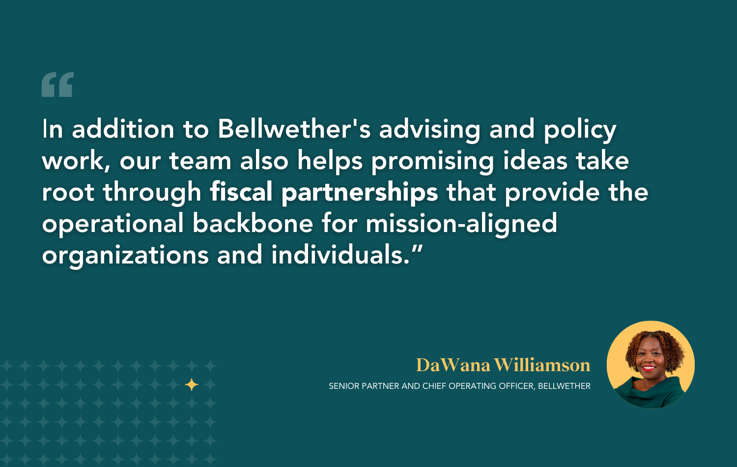 That’s where Bellwether can help. In addition to our advising and policy work, our team of experts also helps promising ideas take root through fiscal partnerships that provide the operational backbone for mission-aligned organizations and individuals. These partnerships allow innovators to stay focused on what matters most: shaping a brighter future for young people.