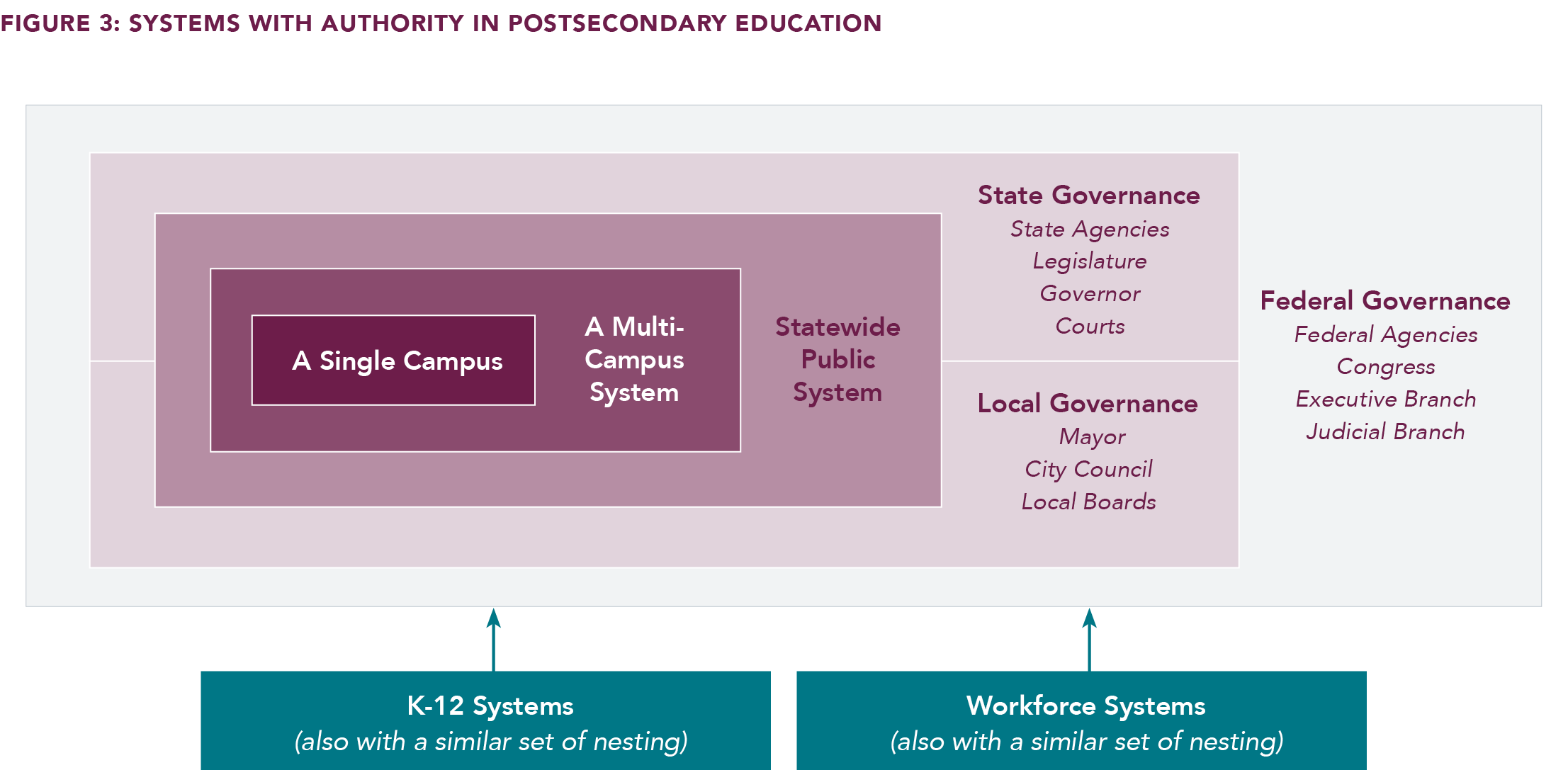 There can be many systems involved in a Systemic Impact campaign, depending on the agenda and which systems own pieces of it. In the postsecondary sector, for instance, authority is held across a range of systems and a given campaign agenda may require engaging with multiple systems to be successful (Figure 3).
