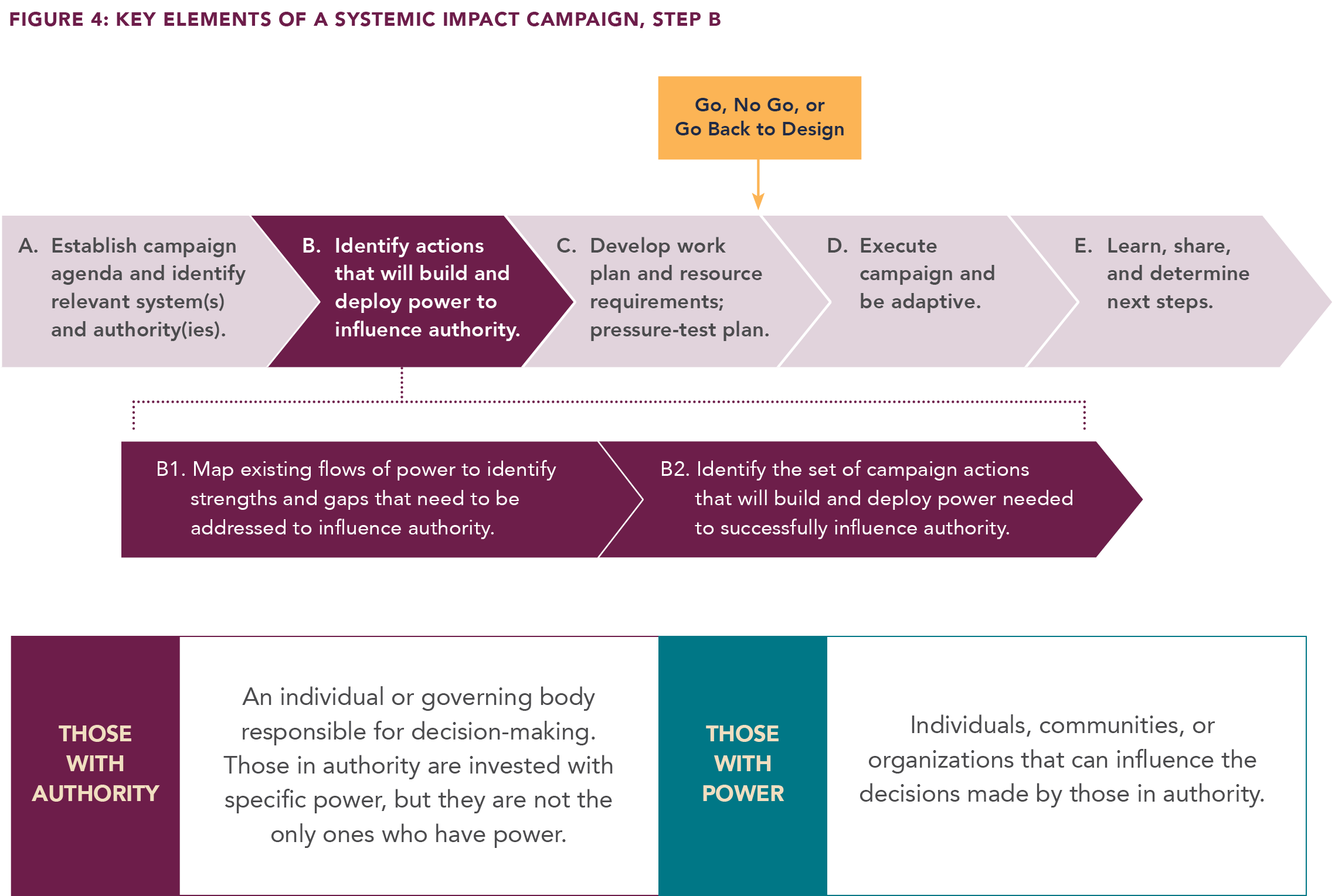 Power in this series is defined as “the ability to decide an agenda and make action happen to advance that agenda.”3 Power is the currency that purchases Systemic Impact. Step B breaks down into two sub-steps, each requiring substantial work to create a campaign plan to build and deploy power (Figure 4).