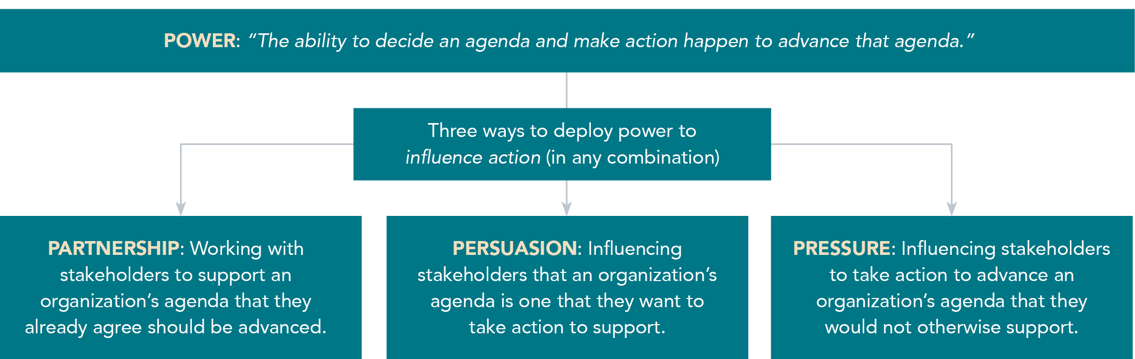 And sometimes power comes from demonstrating its effective use. If organizations act completely anonymously and are not named as part of the conversation or efforts, it reduces their ability to build brand, reputation, and/or power as the work unfolds — limitations that may reduce future ability to generate influence or funding. Sometimes, successful campaigns can have “many parents” with many organizations involved and claiming credit for success; organizations have to balance not claiming more credit than they reasonably deserve, while at the same time ensuring that key stakeholders understand their contribution.