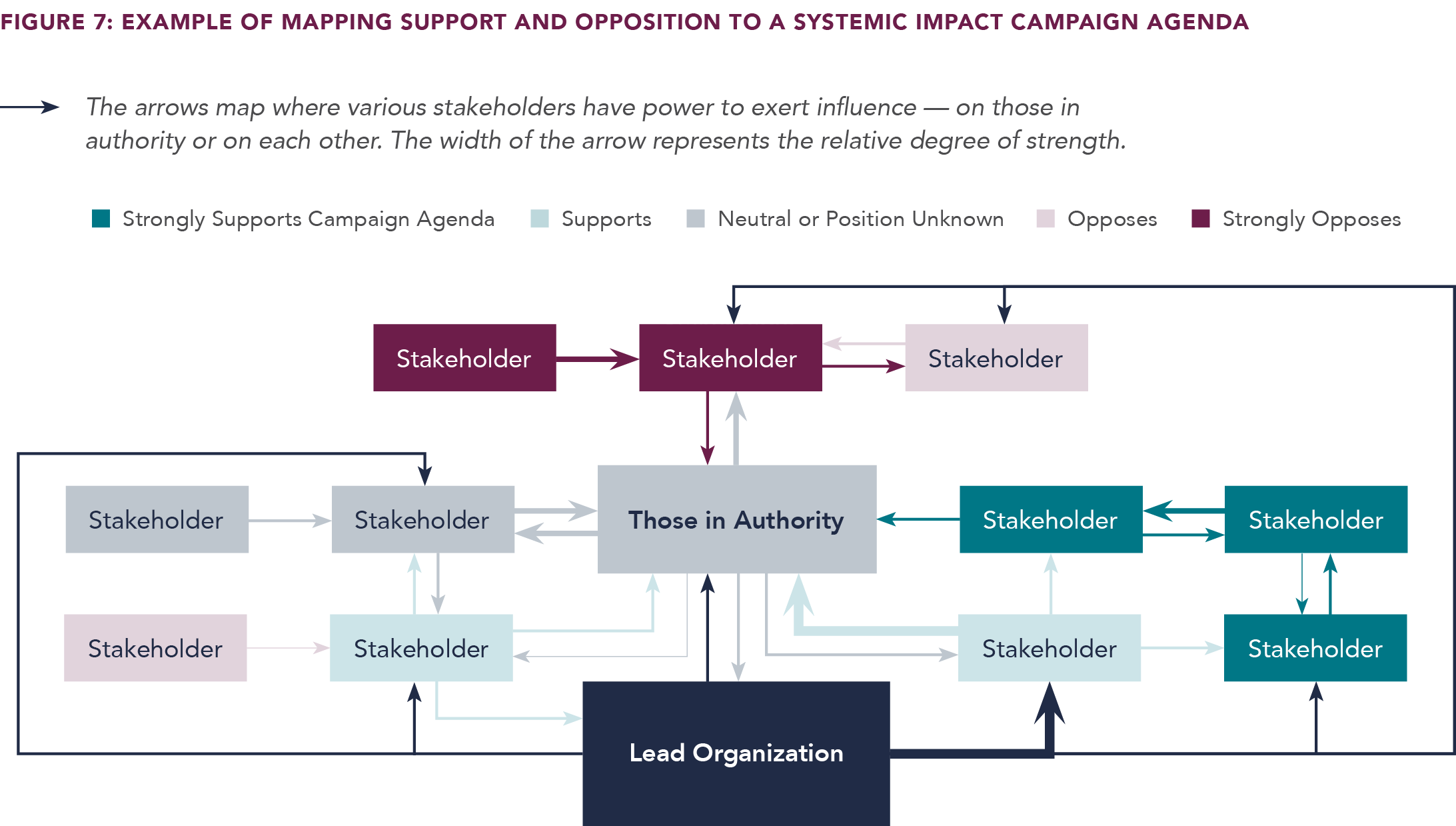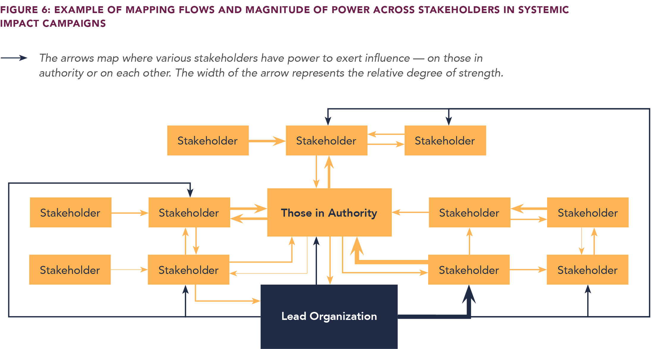 QUESTION 2: How does power currently flow among stakeholders to influence those in authority — including the organization doing the power mapping? Answering this question requires laying out all the stakeholders and mapping how power flows between and among them, recognizing that power often flows in both directions and may be at different degrees of relative strength (Figure 6).