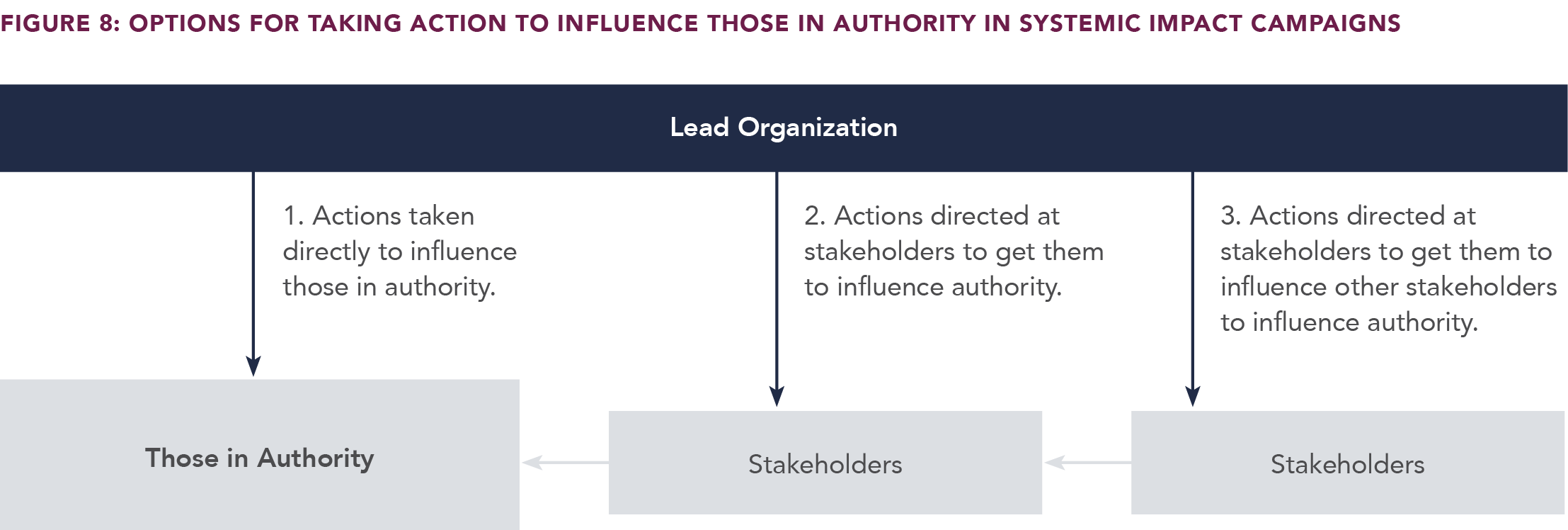 Before advancing a Systemic Impact campaign’s agenda, developing a common understanding of authority and power is important. Through this lens, power can then be deployed in three ways, and in any sequence and combination (Figure 5). As Chris Avery, vice president of program strategy and partnerships at Heights Philadelphia, observed, “We learned that pressure must be coupled with credible partnership, and that systems shift faster when leaders feel both supported and accountable, not cornered.”4