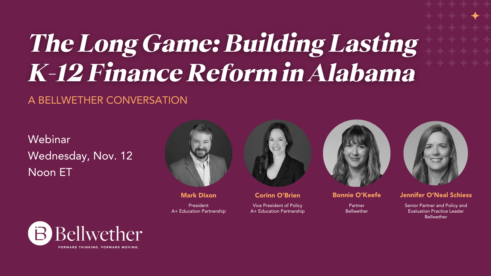 Join Bellwether for a conversation with the leaders who helped shape this reform. It explores the conditions, coalition-building, and political strategy that transformed ideas into policy, the challenges and opportunities that come with implementation, and what other states tackling reform can learn from the work in Alabama.